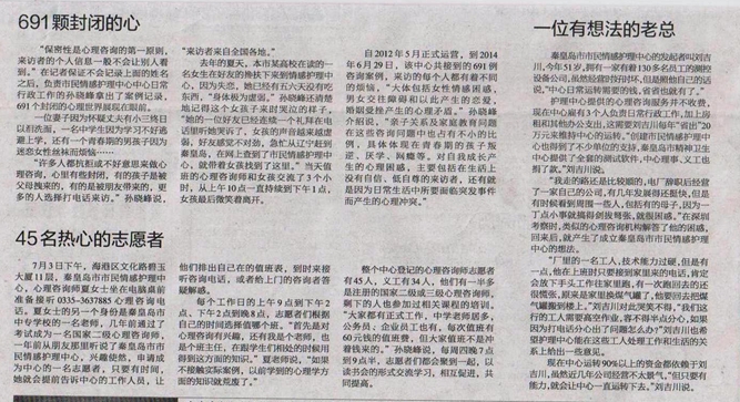 總經(jīng)理劉吉川先生的這一善行,受到了社會(huì)各界的廣泛關(guān)注,燕趙都市報(bào)、秦皇島晚報(bào)等各大媒體先后進(jìn)行了采訪和報(bào)道。這也使得秦皇島市市民情感護(hù)理中心更廣泛的為人所知,從而能夠給廣大民眾提供更多的幫助,更好地服務(wù)于人民、服務(wù)于社會(huì),最終為打造積極生態(tài)圈、構(gòu)建和諧社會(huì)、實(shí)現(xiàn)偉大的中國(guó)夢(mèng)貢獻(xiàn)力量!