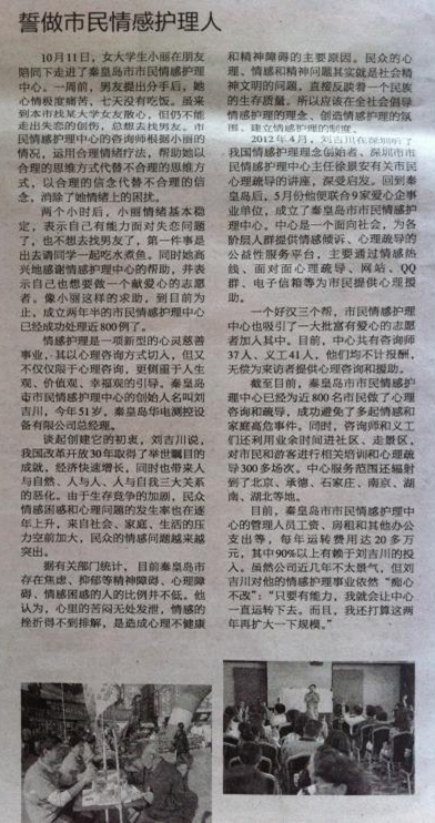 摘自《秦皇島晚報(bào)》(2014年10月15日,B15版):情感護(hù)理是一項(xiàng)新型的心靈慈善事業(yè),其以心理咨詢方式切入,但又不僅僅限于心理咨詢,更側(cè)重于人生觀、價(jià)值觀、幸福觀的引導(dǎo)。秦皇島市市民情感護(hù)理中心的創(chuàng)始人名叫劉吉川,今年51歲,秦皇島華電測(cè)控設(shè)備有限公司總經(jīng)理。