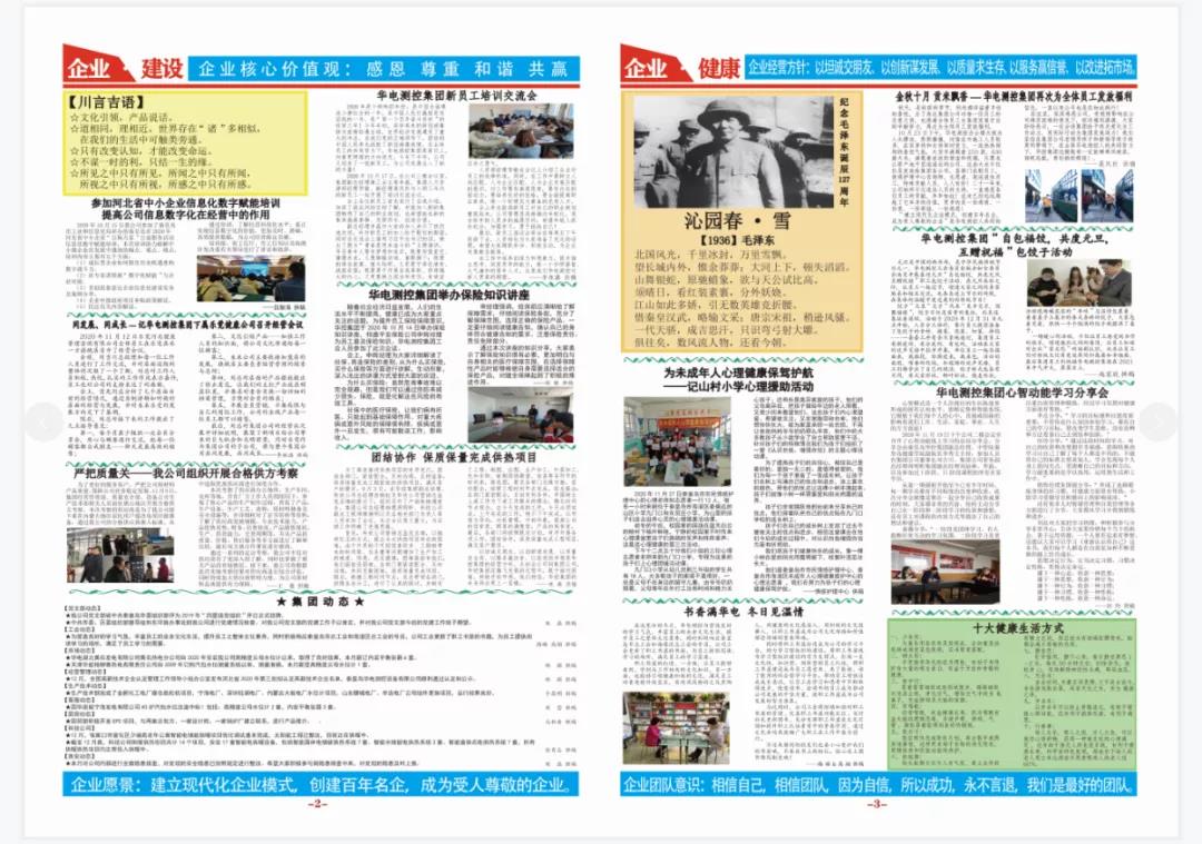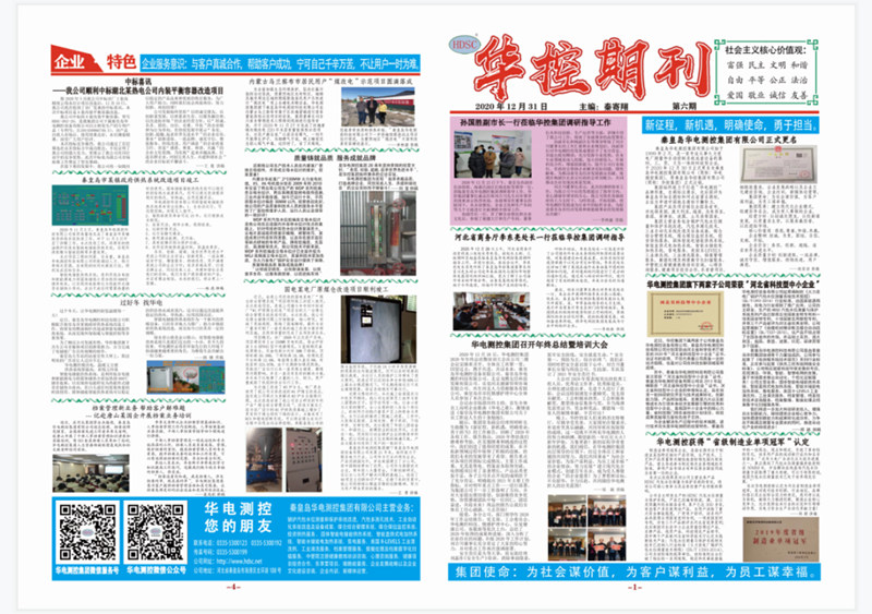 華電測控期刊自創(chuàng)建成立以來,以集團各子公司發(fā)展主營業(yè)務、黨建活動、情感護理、健康管理為內容,旨在向大家宣傳公司的企業(yè)文化和致力于打造“華電測控”品牌形象,堅持為社會謀價值、為客戶謀利益、為員工謀幸福的集團使命;堅持建立現(xiàn)代化企業(yè)模式、創(chuàng)建百年名企、成為受人尊敬企業(yè)的集團愿景;堅持“以坦誠交朋友、以創(chuàng)新謀發(fā)展、以質量求生存、以服務贏信譽、以改進拓市場”的企業(yè)經(jīng)營方針;以“坦誠、負責、團結、自信、克難、開拓”的企業(yè)精神為行為導向;在持續(xù)發(fā)展中展示“務實、創(chuàng)新、超越、追求世界先進水平”的企業(yè)宗旨;秉承“創(chuàng)新進取、一流品牌、誠實守信、增值服務、持續(xù)改進、用戶滿意”的企業(yè)質量方針;營造“感恩、尊重、和諧、共贏”的企業(yè)文化氛圍。