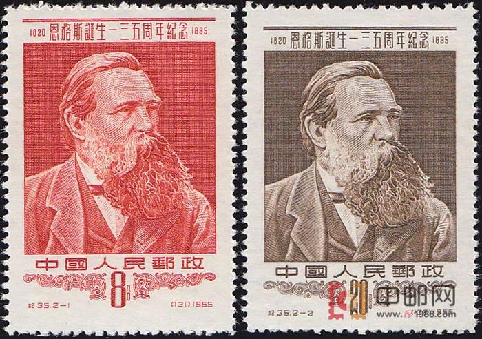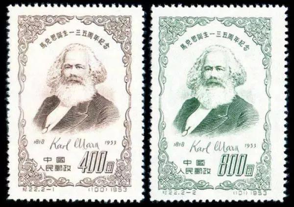1958年7月1日,原郵電部發(fā)行紀51《共產(chǎn)黨宣言發(fā)表一百一十周年》紀念郵票,全套2枚,由孫傳哲設計,中國近代印刷公司雕刻版印刷。其中第一枚“馬克思和恩格斯像”,面值4分。圖案為充滿睿智、蓄著胡須的馬克思和恩格斯側(cè)面像。