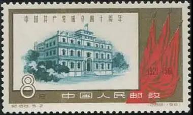 作為“南昌起義”總指揮部的“八一南昌起義大樓”是一座灰色磚混結(jié)構(gòu)建筑,它坐落在南昌中山路和勝利路交叉處的洗馬池,原名“江西大旅社”,現(xiàn)已改建為“八一南昌起義紀念館”。這座建筑曾多次登上郵票。其中發(fā)行于1961年7月1日的“紀88 5-2”,即《中國共產(chǎn)黨成立四十周年》郵票中的第二枚,面值8分,畫面圖案以金色作邊框,具有鮮明的時代特征。