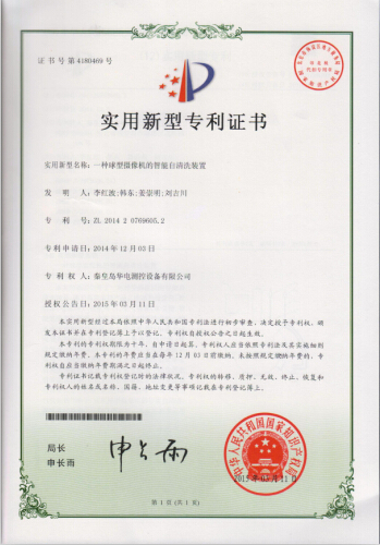 公司于2014年12月03日提交的“一種球型攝像機(jī)的智能自清洗裝置”專利已被中華人民共和國(guó)國(guó)家知識(shí)產(chǎn)權(quán)局頒發(fā)專利證書。
