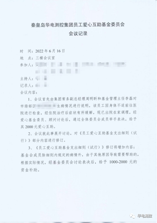 華電測控集團(tuán)的發(fā)展壯大,離不開每一位員工的辛勤付出!近日,得知市場部某位老員工患病的消息后,集團(tuán)愛心互助基金委員會(huì)迅速組織召開會(huì)議,為老員工獻(xiàn)上了一份愛心。