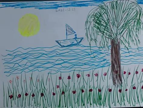 另一幅畫的作者,說自己畫這畫時(shí),心里感覺可幸福了。坐在小船里的人就是自己,正在大海中徜徉。海岸上有很多的花兒開放著,還有一顆大樹。當(dāng)然還有自己的愛人和孩子,藍(lán)藍(lán)的天空,一個(gè)大大的太陽。