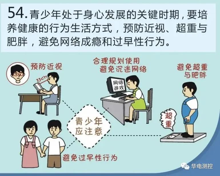青少年是祖國的未來,提高他們的健康素養(yǎng),是實現(xiàn)健康中國戰(zhàn)略目標的關(guān)鍵?!吨袊窠】邓仞B(yǎng)—基本知識與技能》第二部分,關(guān)于“健康生活方式與行為”,其中第五十四條強調(diào):“青少年處于身心發(fā)展的關(guān)鍵時期,要培養(yǎng)健康的行為生活方式,預(yù)防近視、超重與肥胖,避免網(wǎng)絡(luò)成癮和過早性行為。”