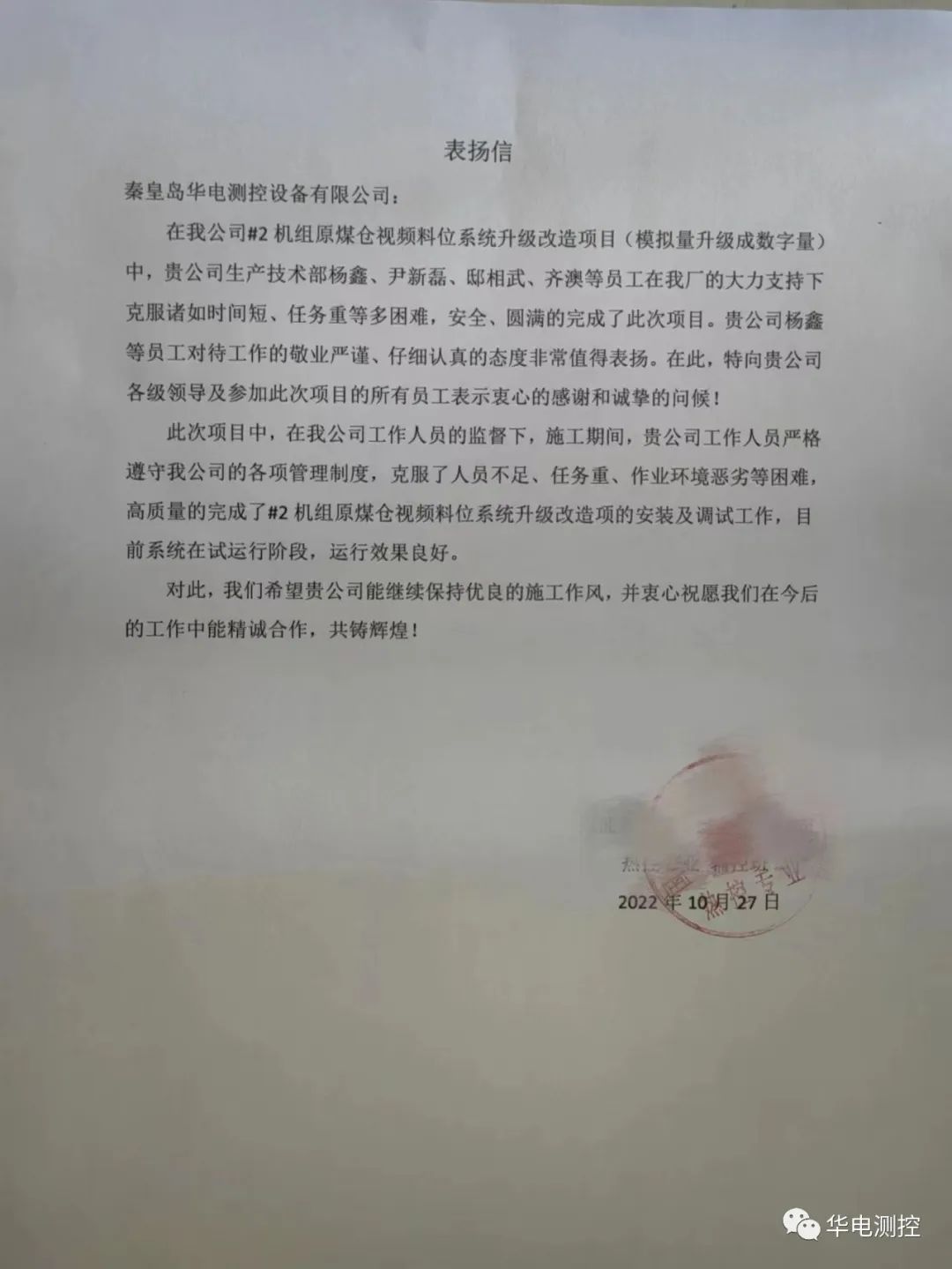客戶對我們產(chǎn)品和服務的認可,便是我們最大的收獲和動力。秦皇島華電測控設備有限公司一直以來秉承著“以坦誠交朋友,以創(chuàng)新謀發(fā)展,以質(zhì)量求生存,以服務贏信譽,以改進拓市場”的企業(yè)經(jīng)營方針,急用戶之所急、產(chǎn)用戶之所需,為電廠安全運行保駕護航。