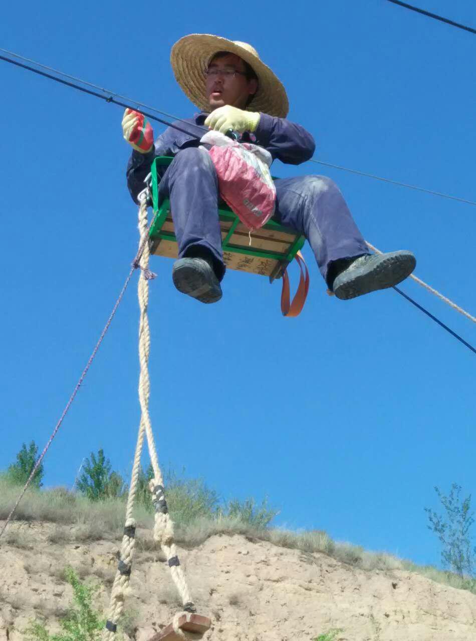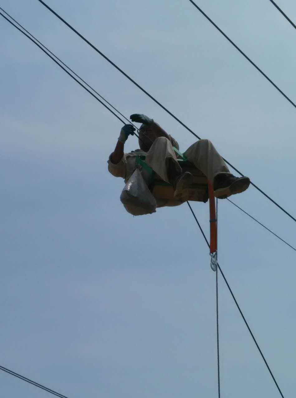 在這次工程中,最為辛苦的就是“倒桿子”了,寧愿多掛幾個夾子也不愿倒桿子,因為每倒一次都會耗費大量的體力,讓人汗流浹背、氣喘吁吁,施工人員相當于穿著一件40斤左右的鐵褲衩 在一人粗細的桿頂左右移動工作。最讓人煩惱的是當小車上的人員處于兩根電線桿之間的位子時鋼纜滑滑小車滑輪外,需要耗費極大的體力才能將它重新弄好,由于處于那時我們用力會無處生根,只能用撬棍一點一點撬,一弄就得一個小時左右,上不去下不來,那過程,真不是一般的“酸爽”!