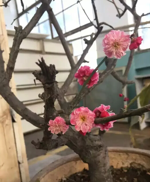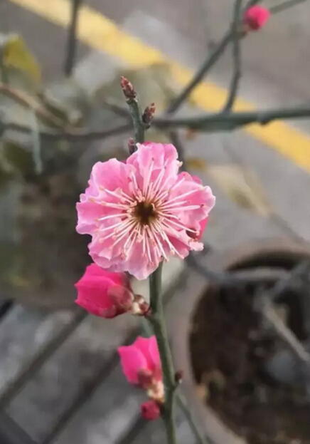也許是工作的繁忙讓我經(jīng)常忽略周?chē)沫h(huán)境變化,今天不經(jīng)意的一瞥,竟然發(fā)現(xiàn)了幾朵嬌艷的粉色?。?!那是保潔姐放在車(chē)間一盆不起眼的“干樹(shù)杈”,我走近一看,竟然冒出了好幾朵粉嫩的花,有的含苞待放、有的正在盛開(kāi),湊近一聞一股黯然凜冽的幽香撲鼻而來(lái),沁人心脾。