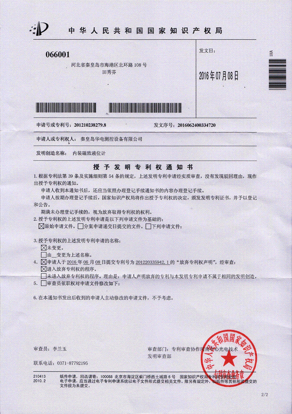 【企業(yè)要聞】喜訊:公司申請的“內(nèi)裝磁致液位計”發(fā)明專利授權(quán)