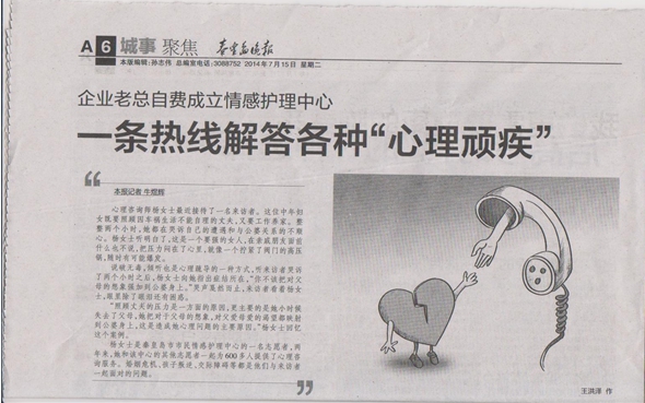 摘自《秦皇島晚報(bào)》(2014年10月15日,B15版):情感護(hù)理是一項(xiàng)新型的心靈慈善事業(yè),其以心理咨詢方式切入,但又不僅僅限于心理咨詢,更側(cè)重于人生觀、價(jià)值觀、幸福觀的引導(dǎo)。秦皇島市市民情感護(hù)理中心的創(chuàng)始人名叫劉吉川,今年51歲,秦皇島華電測(cè)控設(shè)備有限公司總經(jīng)理。