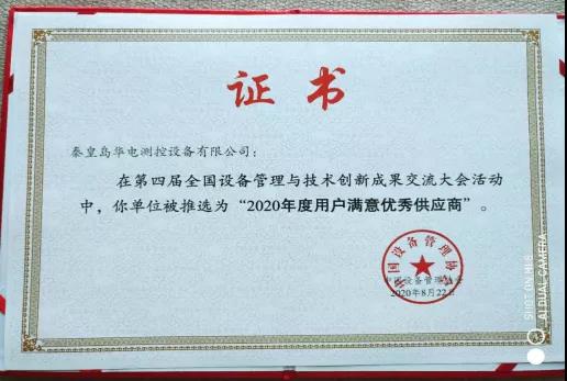 2020年8月22日,秦皇島華電測(cè)控設(shè)備有限公司應(yīng)中國(guó)設(shè)備管理協(xié)會(huì)邀請(qǐng),參加2020年第四屆全國(guó)設(shè)備管理與技術(shù)創(chuàng)新成果交流大會(huì)。并被推薦為“2020年度用戶(hù)滿(mǎn)意優(yōu)秀供應(yīng)商”。