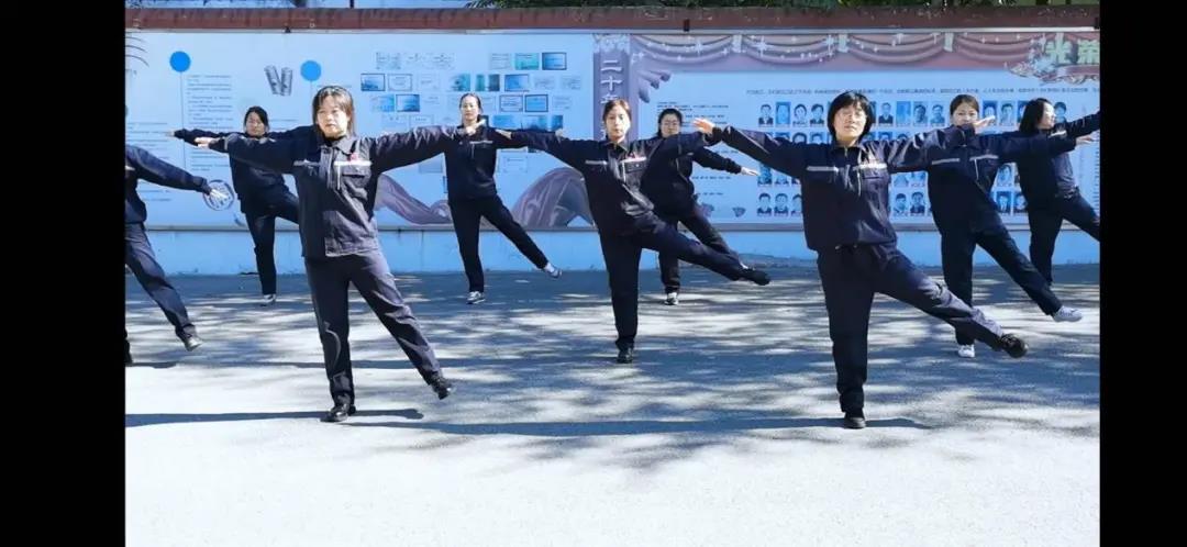 原來,是我們的美女員工們正在操練??矗碇P挺工裝的她們還在為職工廣播體操展演做最后的準備。
