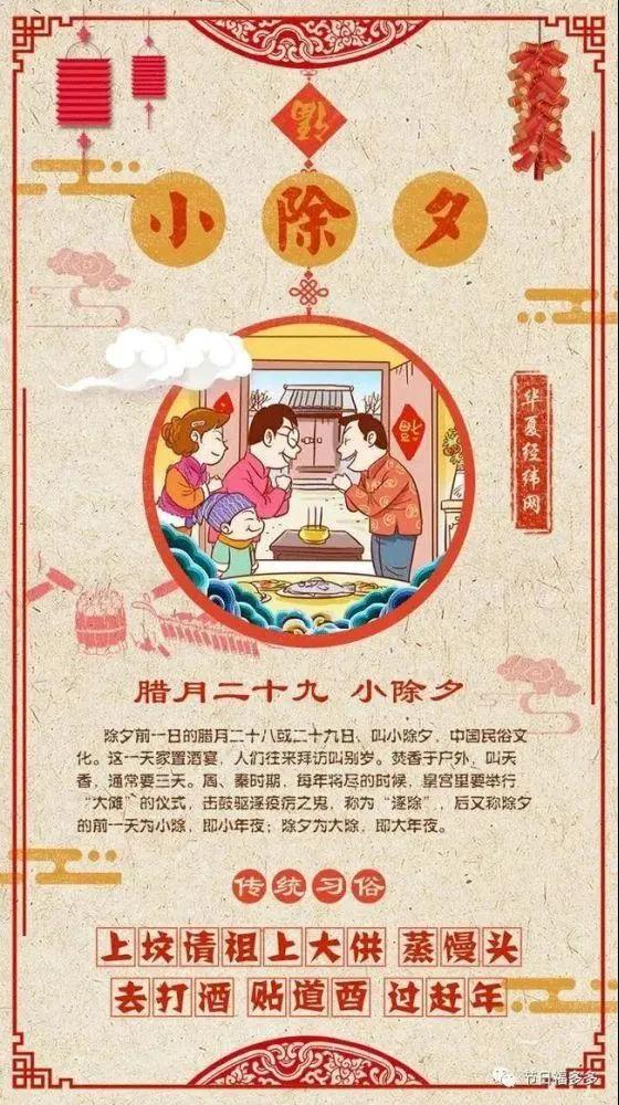 除夕前一日的臘月二十八或二十九日,叫小除夕,中國民俗文化。這一天家置酒宴,人們往來拜訪叫別歲。焚香于戶外,叫天香,通常要三天。