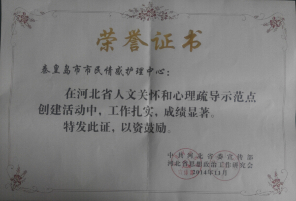 2014年11月,秦皇島市市民情感護(hù)理中心在河北省人文關(guān)懷和心理疏導(dǎo)示范點(diǎn)創(chuàng)建活動中,工作扎實(shí),成績顯著,喜獲中共河北省委宣傳部、河北省思想政治工作研究會頒發(fā)的榮譽(yù)證書。