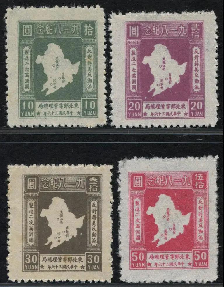 該套郵票一套4枚,圖案相同,就是刷色和面值各異。郵票的圖案主體為中國東北三省地圖,圖中明確標(biāo)明三省省會的位置和各省名稱。圖案上方印刷郵票主題―“ 九一八紀(jì)念”,下方印刷“ 東北郵電管理總局★中華民國三十六年★”發(fā)行單位和發(fā)行時間,左右兩側(cè)印刷當(dāng)時的口號“ 反對蔣美反動派,制造二次滿洲國”。這套郵票是由哈爾濱廣發(fā)印刷所承印,特別值得一提的是,該套郵票所用的紙張系為原偽滿洲國郵政局遺留庫存的水印絹絲紙,這也是“九一八事變”之后日本侵略者侵占了東北三省長達(dá)14年的證據(jù)之一(當(dāng)時庫存之大,甚至到建國后,新中國發(fā)行的東普二也使用這款“ 水印紙 ”)。
