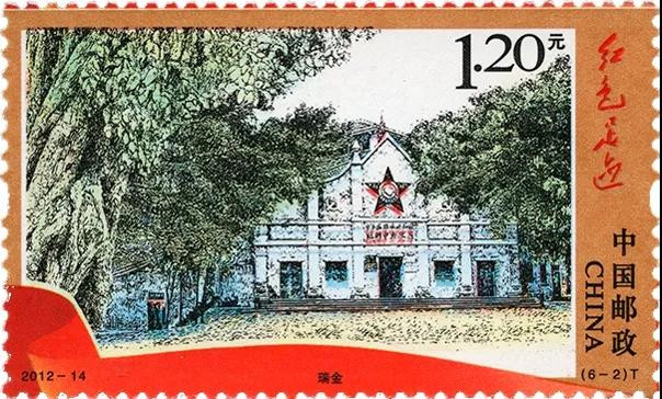 中國(guó)郵政2012年6月30日發(fā)行的《紅色足跡》特種郵票共由六枚郵票組成,分別是井岡山、瑞金、遵義、會(huì)寧、延安、西柏坡六處老革命根據(jù)地的圖案,面值全部是1.20元,其中的(6-2)T 瑞金,面值 1.2元,1253.08萬(wàn)枚。郵票名《紅色足跡》四個(gè)字是設(shè)計(jì)者閻炳武先生采集毛主席的歷來(lái)所書寫的字樣拼組而成。設(shè)計(jì)者是巧妙的運(yùn)用了這種鋼筆淡彩的手法,將每一處根據(jù)地完美的展現(xiàn),無(wú)論是從設(shè)計(jì)、題材、形式方面來(lái)看,這都是一套有價(jià)值的郵票,所以收藏者一直對(duì)它的熱度沒(méi)有減少。