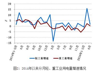 1-4月份,全國工業(yè)用電量12369億千瓦時,同比增長0.2%,增速比上年同期提高1.0個百分點,占全社會用電量的比重為68.4%,對全社會用電量增長的貢獻(xiàn)率為4.5%。其中,輕工業(yè)用電量2075億千瓦時,同比增長3.6%,增速比上年同期提高1.7個百分點;重工業(yè)用電量為10295億千瓦時,同比下降0.5%,增速比上年同期提高0.8個百分點。