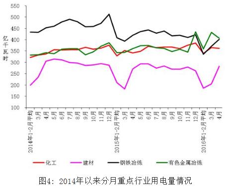 1-4月份,化學(xué)原料制品、非金屬礦物制品、黑色金屬冶煉、有色金屬冶煉四大高載能行業(yè)用電量合計5267億千瓦時,同比下降 4.4%,增速比上年同期回落2.7個百分點;合計用電量占全社會用電量的比重為29.1%,對全社會用電量增長的貢獻(xiàn)率為-47.8%。其中,化工行業(yè)用電量1405億千瓦時,同比增長4.0%,增速比上年同期提高1.1個百分點;建材行業(yè)用電量858億千瓦時,同比下降2.2%,增速比上年同期提高4.3個百分點;黑色金屬冶煉行業(yè)用電量1443億千瓦時,同比下降11.6%;增速比上年同期回落4.7個百分點;有色金屬冶煉行業(yè)1562億千瓦時,同比下降5.4%,增速比上年同期回落9.1個百分點。