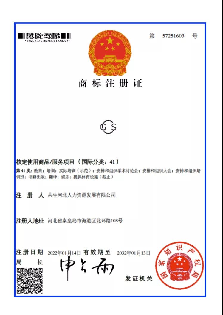 近日,共生河北人力資源發(fā)展有限公司提交的logo被中華人民共和國國家知識產(chǎn)權(quán)局頒發(fā)商標(biāo)注冊證,注冊日:2022年1月14日,授權(quán)公告號:第57251603號。