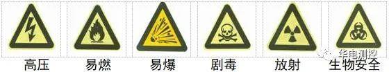 危險標(biāo)識由安全色,幾何圖形和圖形符號構(gòu)成,用以表達(dá)特定的危險信息,提示人們周圍環(huán)境中有相關(guān)危險因素存在。常見的危險標(biāo)識包括高壓、易燃、易爆、劇毒、放射、生物安全等。