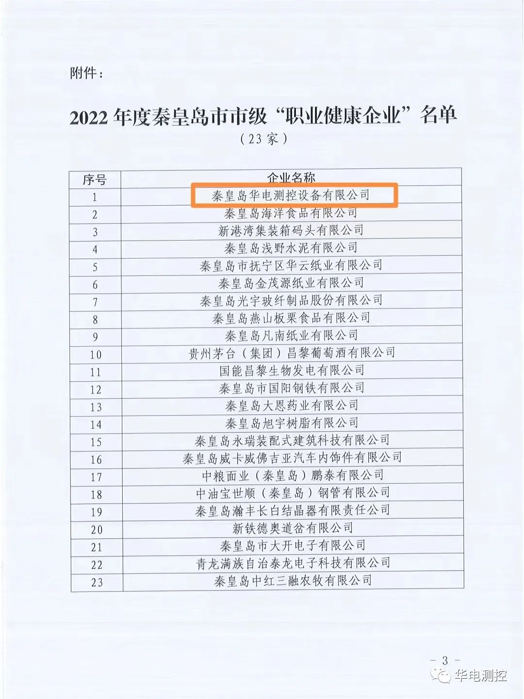 秦皇島華電測控設備有限公司獲評為2022年度秦皇島市職業(yè)健康企業(yè)