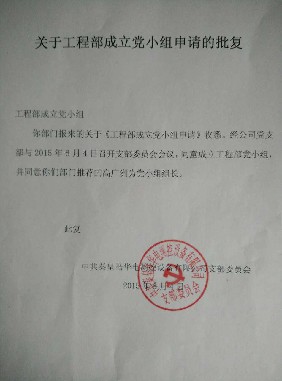 秦皇島華電測控設備有限公司黨組織同意工程部成立黨小組的批復