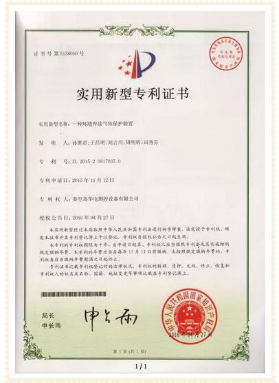 公司于2015年11月12日提交的“一種環(huán)縫焊接氣體保護(hù)裝置”專利已被中華人民共和國國家知識產(chǎn)權(quán)局頒發(fā)實(shí)用新型專利證書。