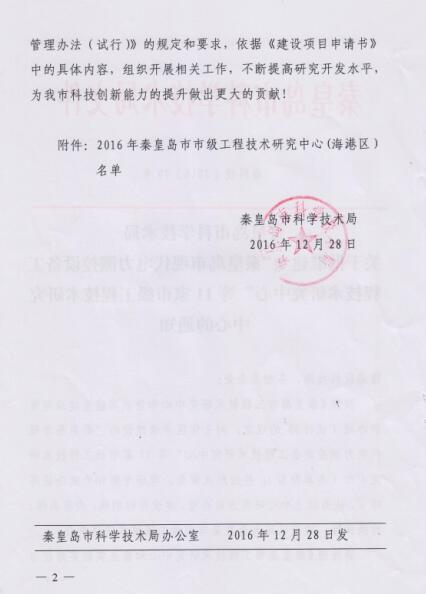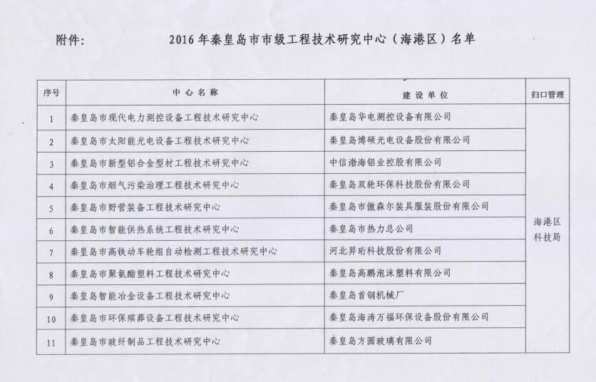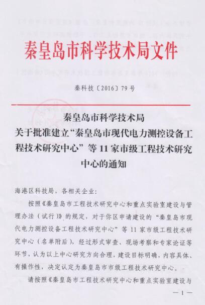 2016年公司申請建設(shè)的“秦皇島現(xiàn)代電力測控設(shè)備工程技術(shù)研究中心”市級工程技術(shù)研究中心,經(jīng)過秦皇島市科學(xué)技術(shù)局組織進行的形式審查、現(xiàn)場考察和專家論證等環(huán)節(jié),認為中心研究方向合理,建設(shè)目標明確,內(nèi)容具體、有操作性,被認定為秦皇島市市級工程技術(shù)研究中心。